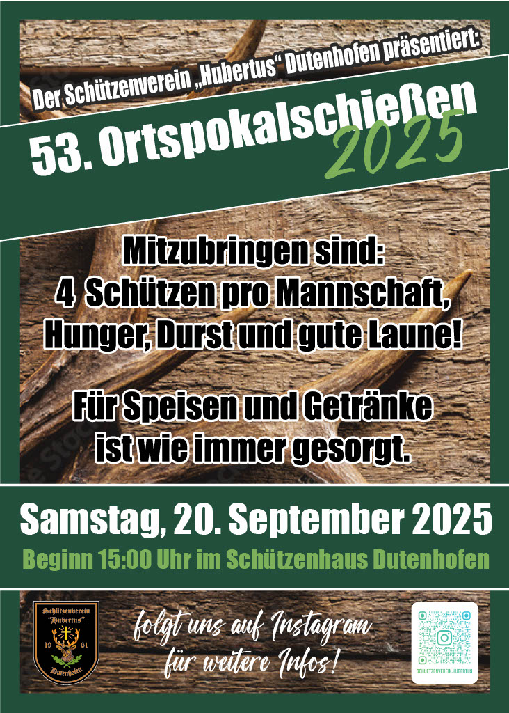 Zum traditionellen Ortspokalschießen, welches am Samstag, dem 20.09.2025 ab 15.00 Uhr in unserem Schützenhaus stattfinden wird, laden wir an dieser Stelle nochmals recht herzlich ein.